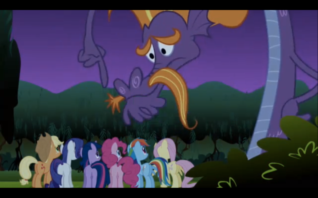 Look! The ponies help a dragon-thingie with his broken moustache!